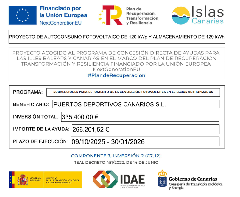 Ayudas destinadas al fomento de la generación fotovoltaica en espacios antropizados, en el marco de la Estrategia de Energía Sostenible en las Islas Canarias (Programa 8, Línea 1), con cargo al instrumento de financiación europeo Fondos “Next Generation EU”, del Plan de Recuperación, Transformación y Resiliencia (Componente 7, Inversión 2). Las actuaciones llevadas a cabo implicaron la implantación de una instalación fotovoltaica compuesta por 200 módulos fotovoltaicos de 600 Wp cada uno, con una potencia total de 120 kWp. Dichas actuaciones se acompañaron de un sistema de baterías de 129 kWh de almacenamiento, con el fin de garantizar la autonomía energética de la organización.
